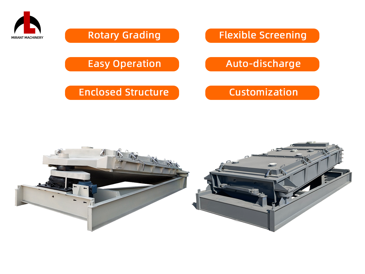 Mirant Gyratory Vibrating Screener (Flat Rotary Screen) is widely used in metallurgy, refractory materials, sand and gravel, ceramsite sand, mining, chemistry, plastics, grain, food, chemical industry, biology, sugar making, salt making, MSG, starch, activated carbon, silicon carbide, soda ash, citric acid, medicine and other industries requiring large production capacity and high purity screening.